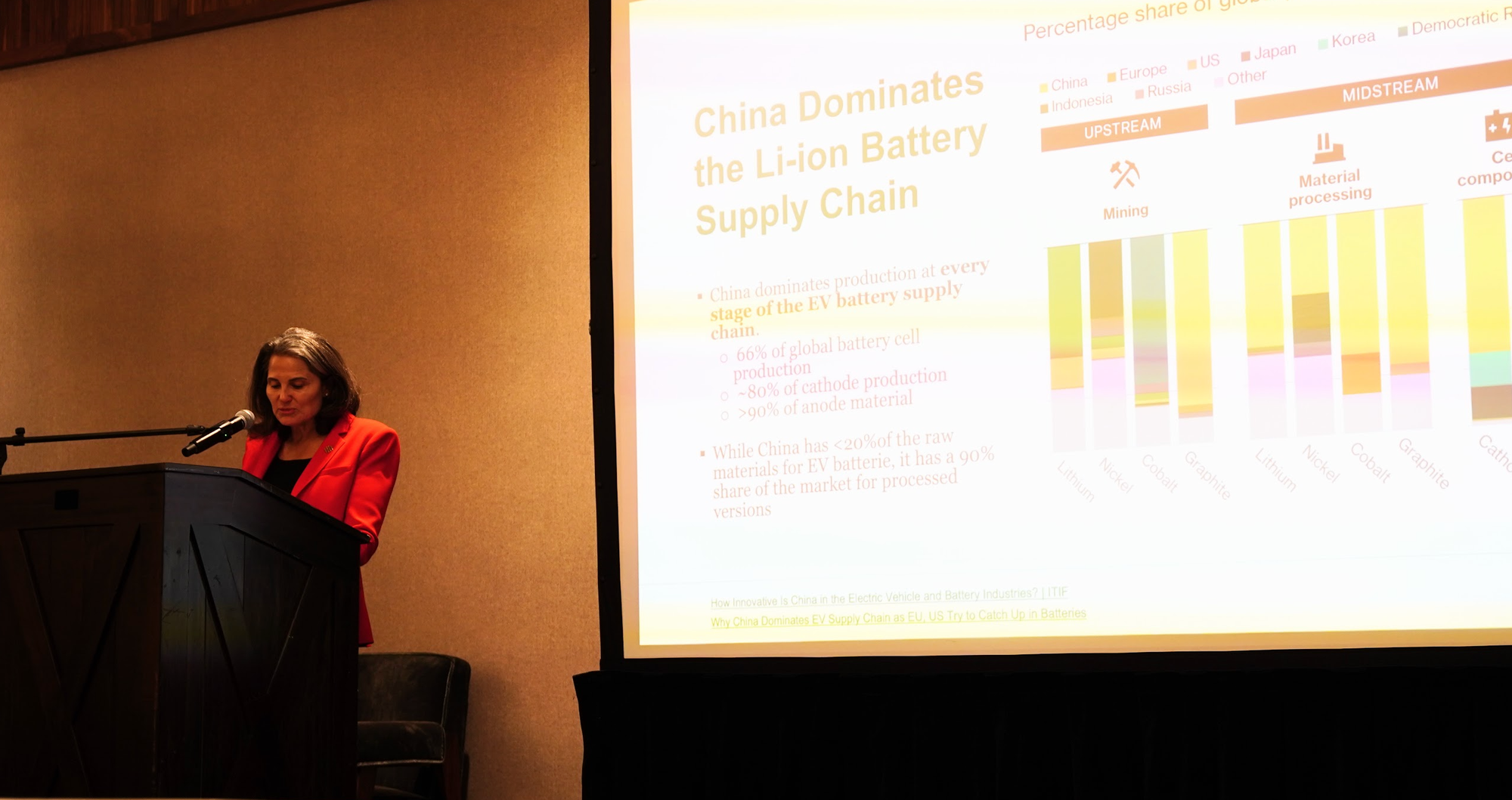 Looking outside the United States, Barbanell highlighted the importance of rare earth metal supply chain security, especially from a global perspective, noting that “China dominates the lithium-ion battery distribution chain, having 66% of global battery cell production, 80% of cathode production, and over 90% of amic material.” Worryingly, “98% of gallium is produced in China, and the US is 100% net import-dependent for gallium, and 50% net import-dependent for germanium.