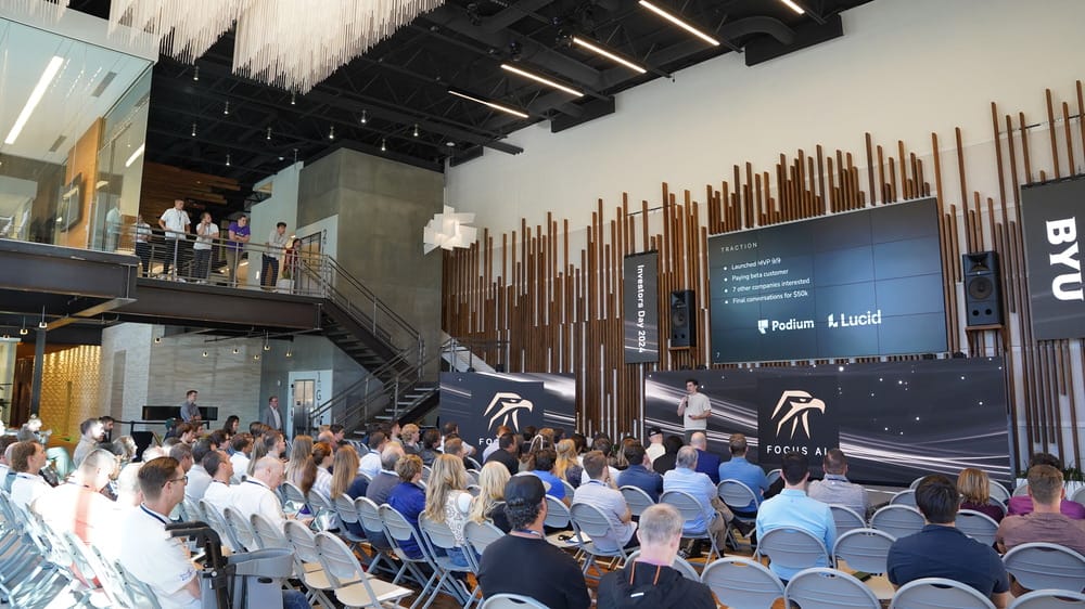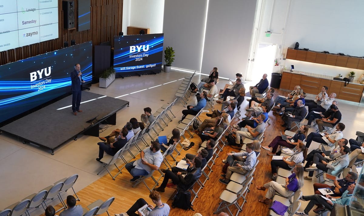 BYU Rollins Center For Entrepreneurship and Technology convened its annual Investors Day on October 4, 2024 to showcase eight BYU startups. Student founders from eight BYU startups gathered at The Garage, John Pestana's personal office located in the Provo's Riverwoods office park. The eight startups presented to a room full of investors, students, faculty, media, and other interested parties. The teams' pitches included details about their products, market fit, traction with customers, revenue projections, and more.