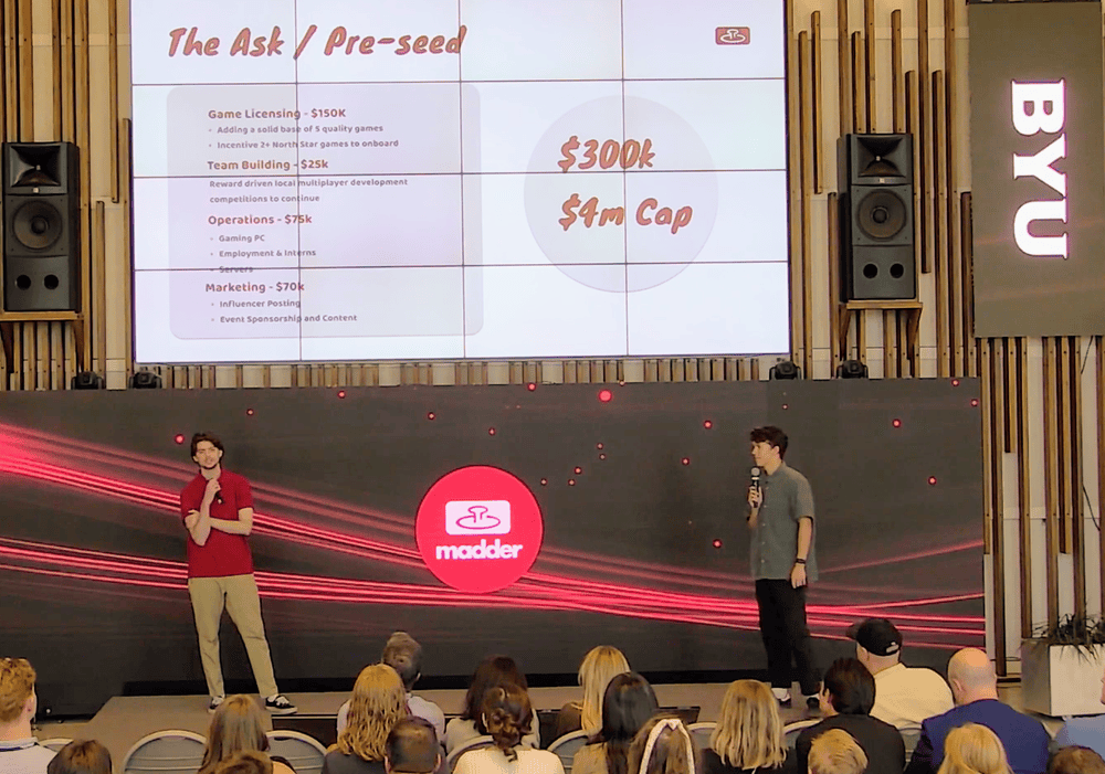 Madder Games is a face to face gaming system that allows groups of up to 12 players to join group games via a web browser using their phones as controllers. Co-founders Easton Allred and TJ Maxwell seek to provide an engaging gaming experience for gamers of all skill levels capturing the biggest part of the $230 billion dollar gaming market. “We're seeing a new resurgence for multiplayer gaming that brings people together, people want to bond with one another, rather than just have that solitary gaming experience,” said Allred.