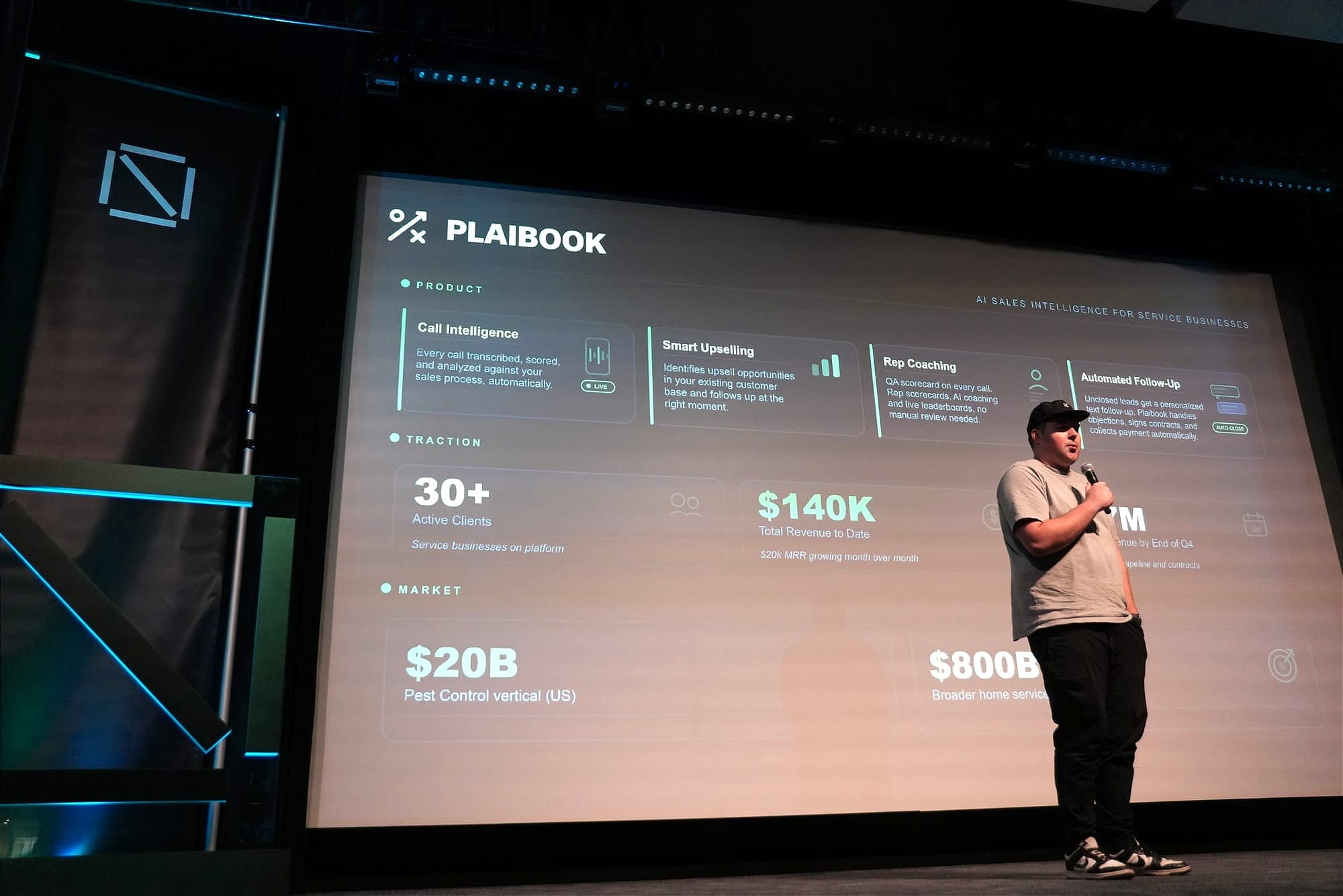 Several of this cohort's most traction-heavy companies are attacking sales and revenue operations. Plaibook, perhaps the most seasoned pitch on the stage, started as a call intelligence tool for a pest control company, pivoted into an AI chatbot that books mosquito control jobs (generating $700,000 in revenue for their first client and a $70,000 cut for the team), and has now evolved into a full call intelligence and automated follow-up platform. With 33 signed clients, $130,000 in revenue, $20,000 in monthly recurring revenue, and a projection of $1.7 million by year-end, Plaibook is the kind of story Sandbox was built to produce.