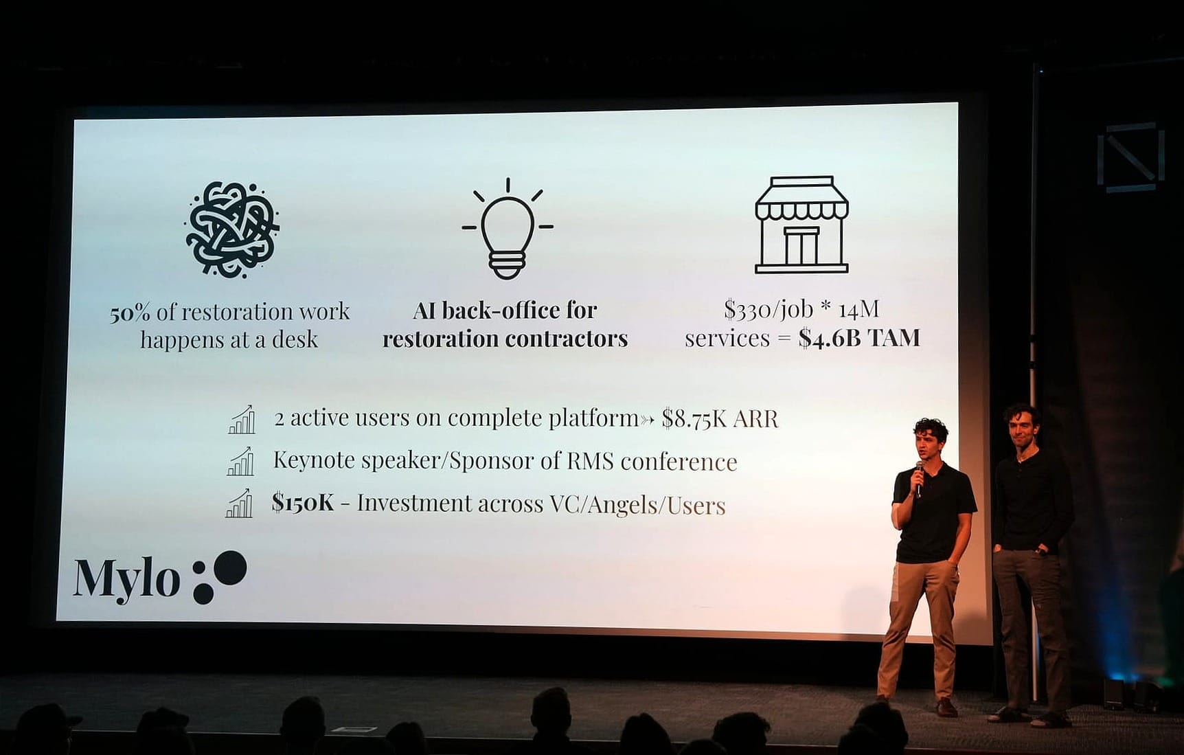 Mylo is building an AI-powered platform to handle the desk work of restoration contracting — insurance negotiation, estimate writing, scheduling, and communication — with five companies onboarded and two transitioning to its more complete product. The team has raised $150,000 and has been invited to keynote the largest restoration conference in Utah in May. The sign company tool (whose name was unclear in the audio) helps sign companies upload a photo of a site and generate measurements, a branded mockup, and a proposal in minutes rather than weeks — 55 users, 50 companies in the pipeline, and $7,000 in MRR after just two months. The team was voted best booth at a recent sign industry expo and is headed to the largest sign expo in the world.