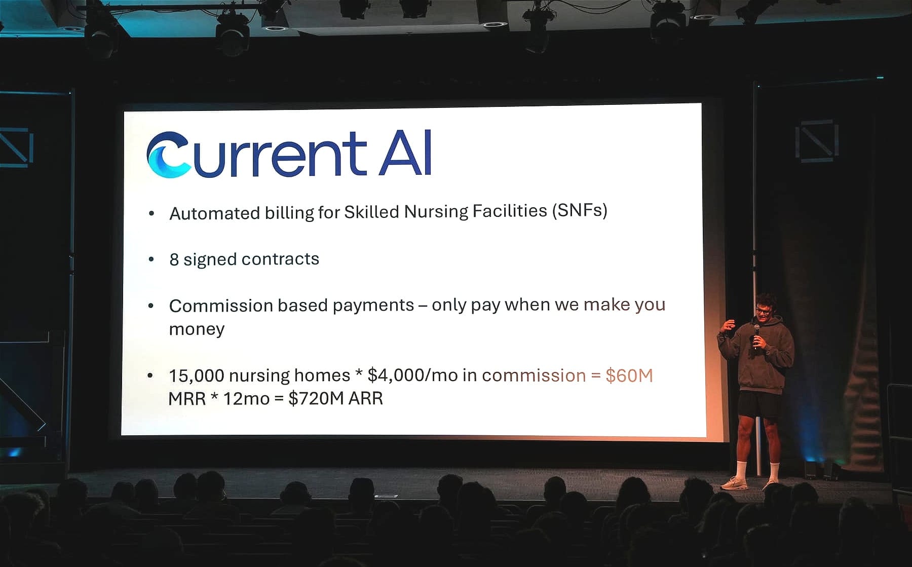 Healthcare dominated a significant slice of the cohort, with multiple teams targeting the skilled nursing and senior living space specifically. Current AI focuses on Medicare billing accuracy — finding claims that skilled nursing facilities missed and taking a commission on what it recovers. With eight signed contracts and large operators who could roll the product across dozens of facilities, the team is chasing what they estimate is a $720 million market. Sauce AI is attacking the intake side of the same industry: ingesting 50-to-200 page patient referral packets and automating admissions decisions for skilled nursing facilities, with three coordinators ready to pay once the product reaches HIPAA compliance.