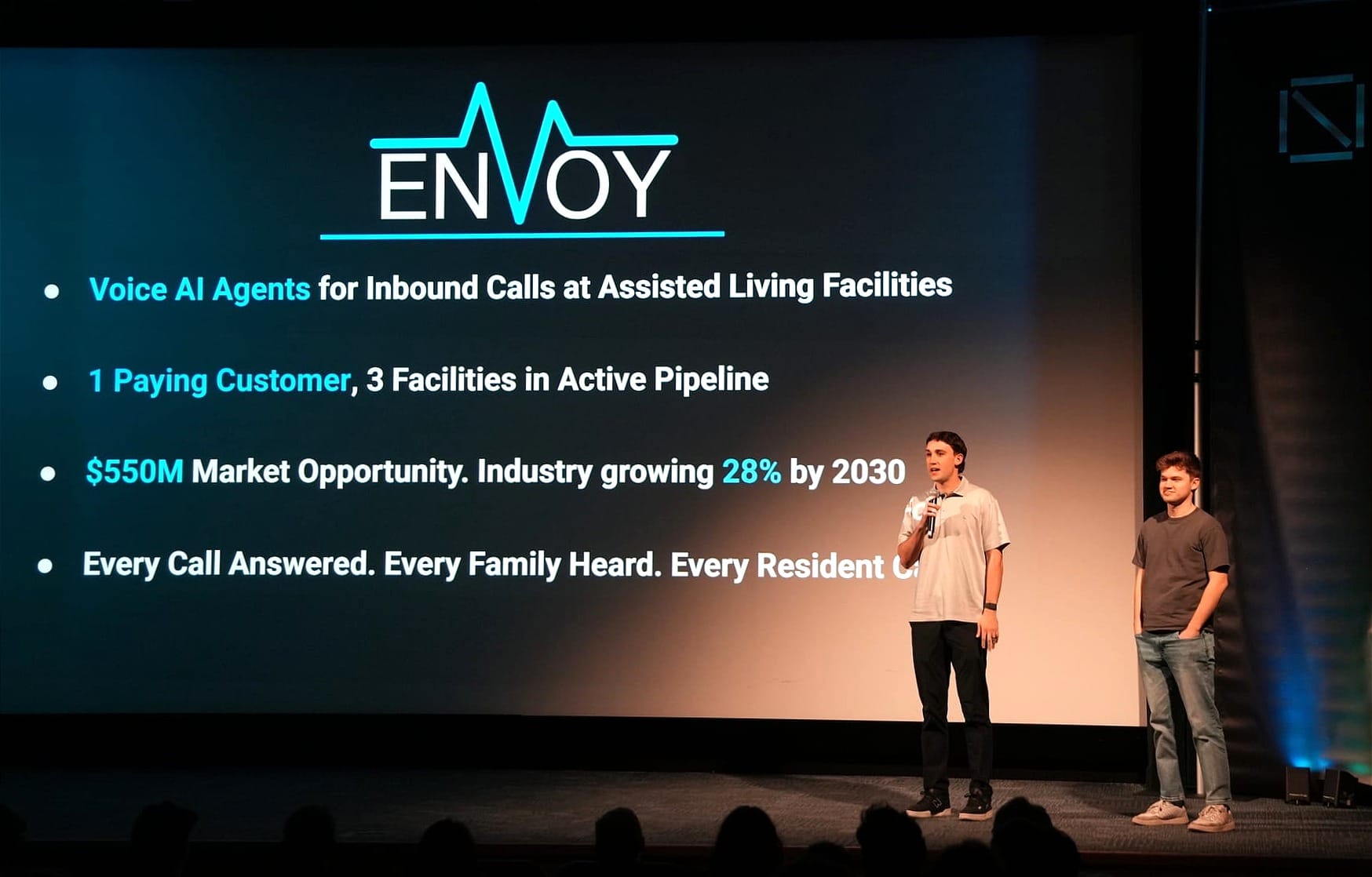 Envoy is using AI voice agents to ensure senior living facilities never miss a call from a family inquiring about a loved one's care, with one paying facility live and three more on the way. Schedule solves a different operational headache at the same facilities — when an employee calls out, the platform texts all eligible staff and adds the first respondent to the shift. With 150 daily users across 40 facilities, Schedule has found a product that fits naturally into how frontline workers actually communicate. Remembrance, one of the cohort's most emotionally resonant pitches, offers early cognitive decline detection for Alzheimer's and dementia, claiming the ability to identify markers three to five years before physical symptoms appear — and reporting $4,000 in monthly recurring revenue after just 30 days.