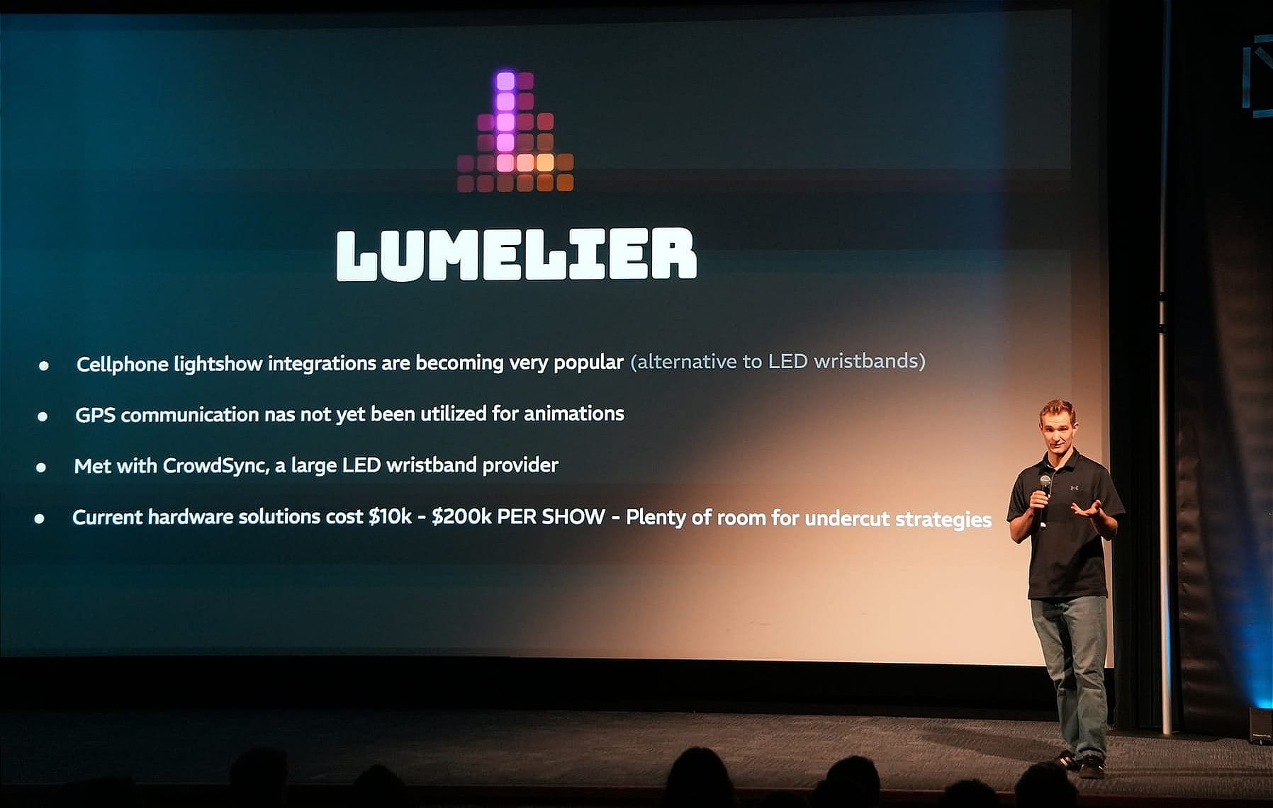 Lumilier is replacing expensive LED concert wristbands with a network server that synchronizes audience cell phone screens into a coordinated light show — effectively turning a crowd into an LCD display. Eight weeks into development, the team is already in conversations with major players in the live events industry.