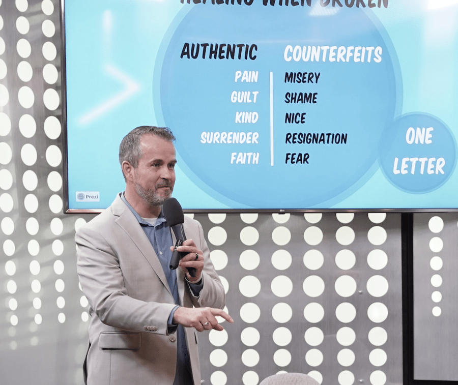For example, Misery is the counterfeit of Pain. Shame is the counterfeit to Guilt. Nice is the counterfeit of Kind. Resignation is the counterfeit to Surrender, Fear is the counterfeit to Faith, and Control is the counterfeit of Power, to name a few of the authentic-counterfeit dyads.