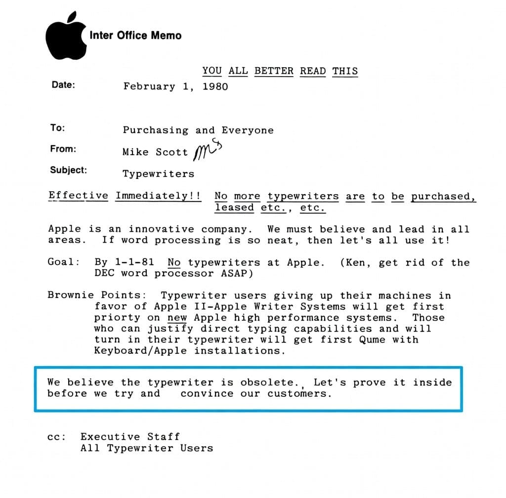 Fairweather pulled out a memo from Mike Scott, who ran operations at Apple around 1980 when the company was still trying to bring the personal computer to market. The problem? Employees inside Apple were still using typewriters.