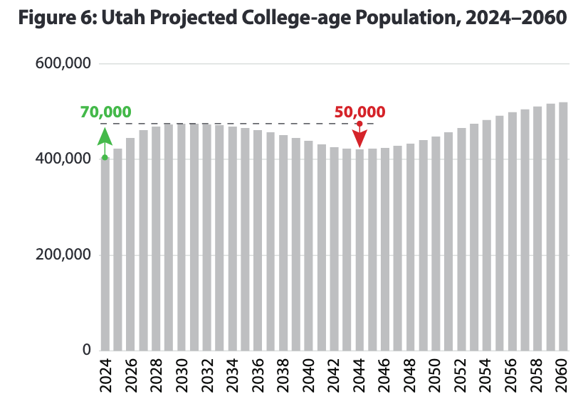 Utah's version differs from the national pattern in an important way. The state is still projected to see a few more years of growth in its college-age population, peaking around 2028 at roughly 475,000. Then comes the decline — followed, unlike the national trend, by a genuine recovery. Utah is projected to return to near-peak levels after the trough.