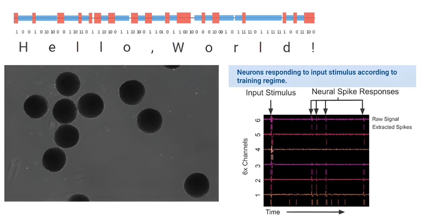 Structured information — arithmetic problems and words — was encoded as electrical stimulation patterns and delivered to the living cells. The neurons responded with measurable electrical spikes, and training altered the timing and frequency of those spikes, allowing distinct computational states to be reliably identified. The result: living cells, tightly coupled to silicon in a feedback loop, performing structured computing tasks.
