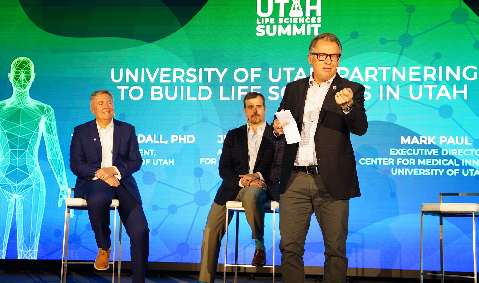 During one one of morning sessions, speakers from the University of Utah, including its president, Taylor Randall, presented contributions from the U that support life sciences in the state. The discussion included the following speakers: