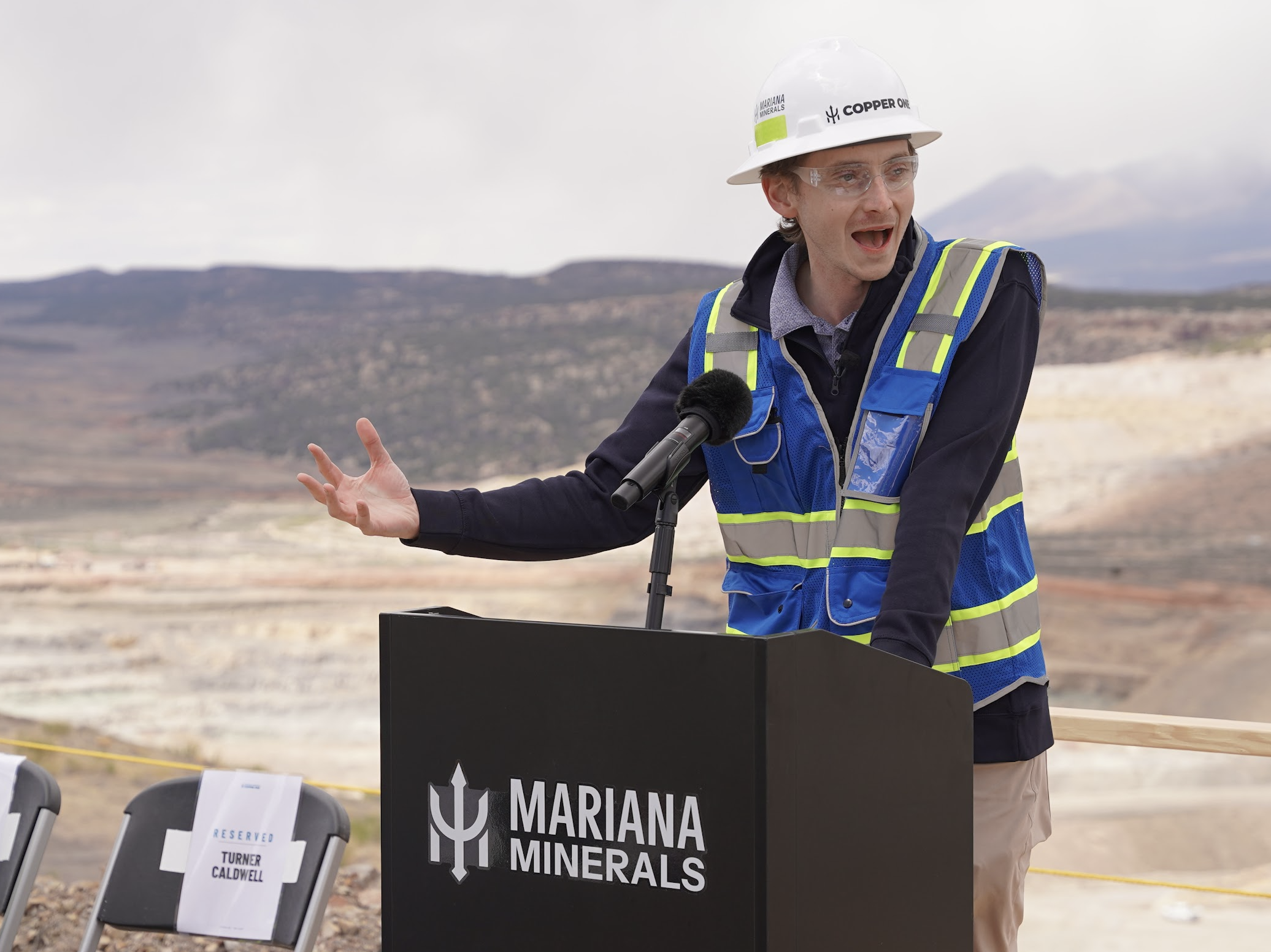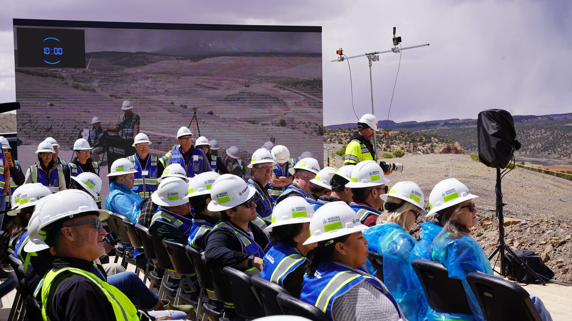 Governor Spencer Cox and Mariana Minerals CEO Turner Caldwell were on the edge of the freshly-built stage overlooking the mine, holding a detonator.