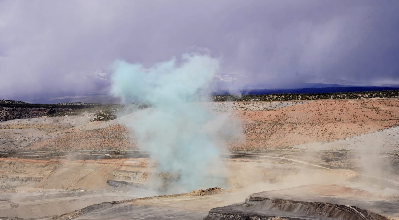 At 2:30 in the afternoon, he pushed the button. A moment later, the floor of the open pit at Copper One rippled — a low, rolling percussion you felt in your chest before you heard it — and a massive plume of dust and rock rose into the Utah sky. Someone had added blue dye to the explosive charge, probably turquoise blue tannerite. The blue cloud bloomed vivid and unmistakable against the darkened sky over the La Sal Mountains — the same range that gives the nearest town its name, and that miners and ranchers in this country have been looking up at for more than a century.