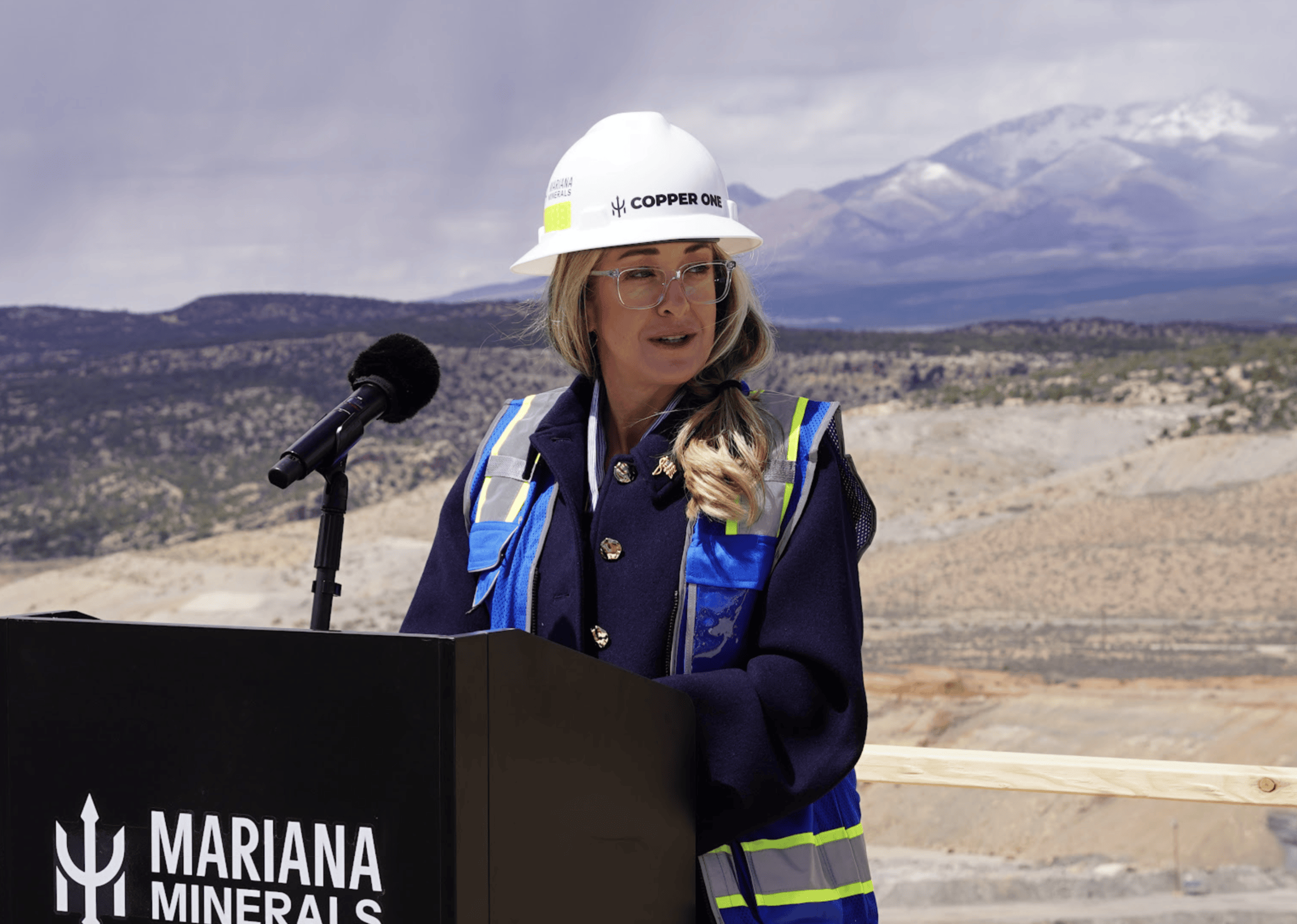 Recommend: Gov. Cox at podium, or Cox / First Lady Abby Cox on the site tour with Caldwell[ Gov. Cox at podium / with detonator ][ Cox, First Lady, and Caldwell on site tour ]Left: Governor Spencer Cox addresses the crowd at Copper One. Right: The Governor and First Lady Abby Cox tour the mine with Mariana CEO Turner Caldwell. Photos: Mark Tullis / TechBuzz