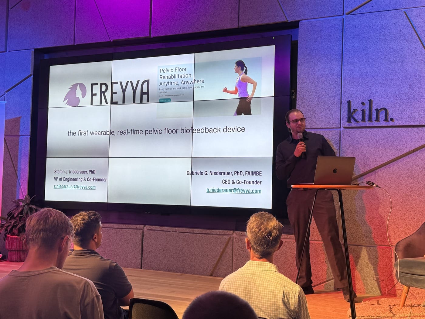 Next up was Freyya, a company tackling pelvic floor disorders with a wearable device that offers women accessible, private, and effective therapy. “One in four women suffers from pelvic floor dysfunction,” said Stefan. “It’s not just uncomfortable. Left untreated, it becomes one of the top reasons women end up in long-term care.” Freyya’s device is about the size of a tampon and tracks both pelvic floor force and abdominal pressure. “Other tools only work lying down. Our solution works during real-life movement, which is when symptoms actually happen,” he added. Co-founder Gabi emphasized the personal mission behind the product: “The goal is to bring therapy into the home. It’s personal. It’s overdue.”