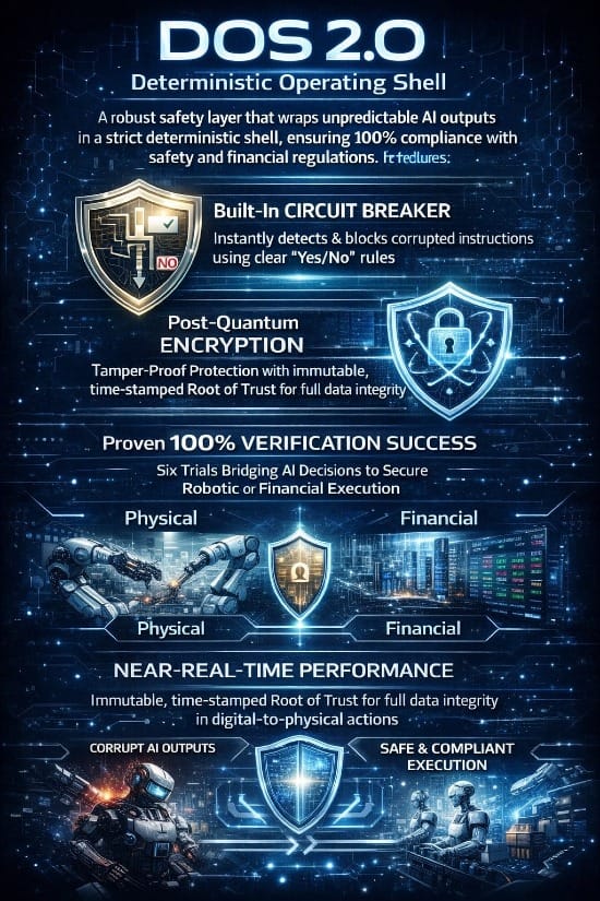 At its core, DOS 2.0™ acts as a deterministic shell around probabilistic AI outputs. Probabilistic AI can still generate predictions or suggestions, but only actions that meet strict, predefined logical and cryptographic rules are allowed to execute.