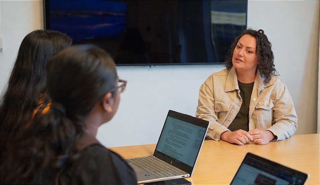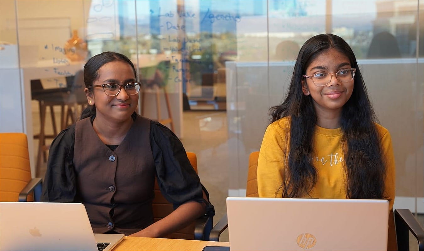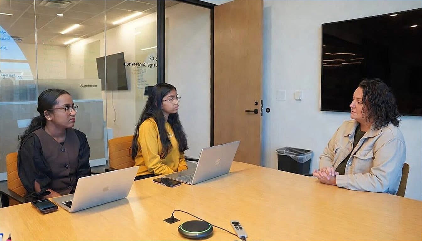 Samhita Chavakula and Jaswitha Jadapalli, 2025-26 SheTech Media Interns with Women Tech Council and TechBuzz News, interviewing Brittney Vierra at the TechBuzz offices in South Jordan, Utah