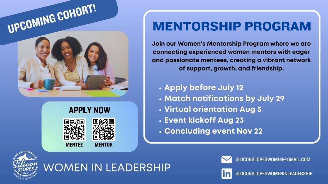 Silicon Slopes Women In Leadership Program is accepting applications for the Fall 2024 cohort. The 50-person cohort will run from August to November 2024. It is accepting applications for mentors and mentees. The group will select 25 mentees and 25 mentors.