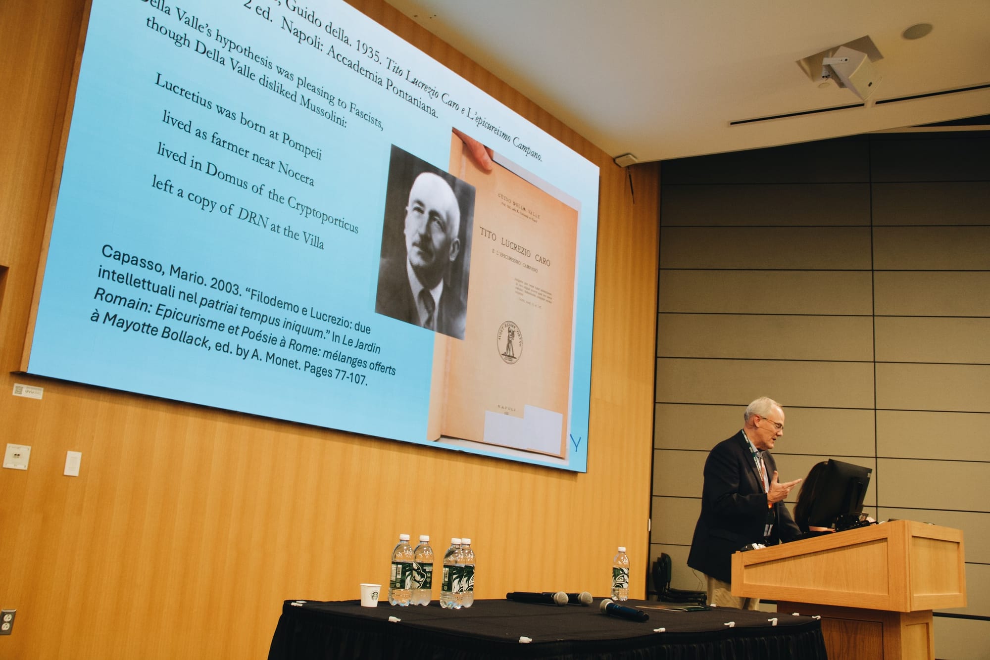 Kleve's identification depended on reading specific words that Lucretius uses in a particular passage of Book Five. Macfarlane showed the audience the relevant line and offered his own reading of what the papyrus actually seems to say. The letters don't match. Mario Capasso, the eminent Italian papyrologist who died recently, was among the skeptics. He traced the desire to find Lucretius at Herculaneum back to nationalist motivations in the 1920s — a longing, in some quarters, for the great poet to have lived near Pompeii, to have farmed the nearby hillsides, to have left his masterwork at the Villa of the Papyri.