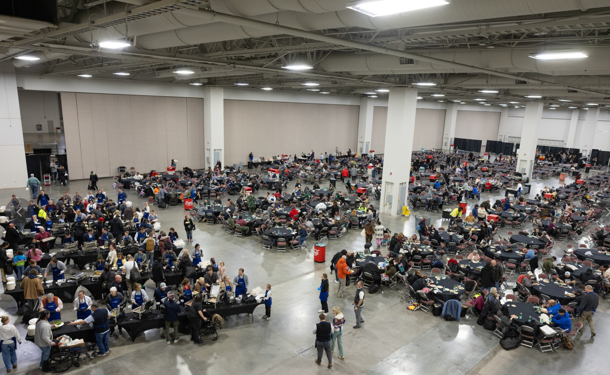 The event, now approaching its 30th year, filled the Salt Palace Convention Center with hundreds of volunteers, community partners, and local leaders. Guests received a full Thanksgiving dinner—turkey, ham, potatoes, gravy, stuffing, vegetables, rolls, and dessert—along with free access to medical, legal, vision, dental, mental-health, and other vital services.