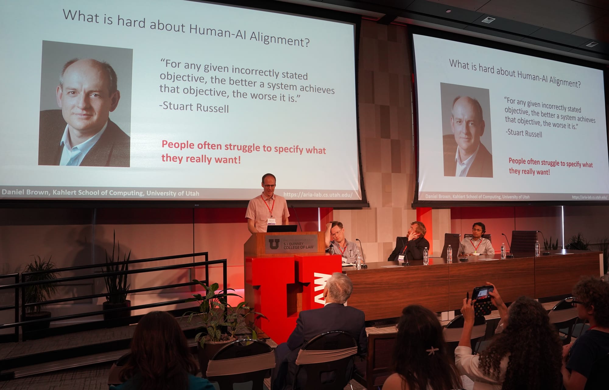 Daniel Brown, Assistant Professor in the Kahlert School of Computing, delivered a particularly captivating talk on developing robust, interactive, and human-aligned AI systems. Leading the Aligned, Robust, Interactive Autonomy (ARIA) Lab, Brown emphasized the "alignment problem"—ensuring AI systems do what humans intend. He highlighted the difficulty of specifying objectives, quoting Stuart Russell: “For any given incorrectly stated objective, the better a system is at that objective, the worse it is at correction.” Brown illustrated this with examples like social media recommender systems, where maximizing click-through rates can lead to polarization and misinformation. His lab focuses on incorporating human feedback—through natural language, facial expressions, demonstrations, and comparisons—to create AI that adapts to user preferences despite noisy or ambiguous input.
