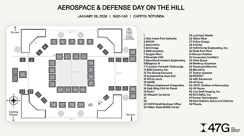 47G will host its annual Utah Aerospace & Defense Day on the Hill on Wednesday, January 28, 2026, bringing Utah’s aerospace and defense ecosystem to the center of state policymaking. The premier annual event will feature more than 50 interactive exhibits representing nearly 100 companies across the state’s fast-growing aerospace, defense, and advanced technology sectors.