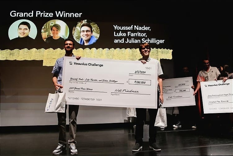 Nat Freedman and Daniel Gross, both well-known figures in the tech investment world, saw the inflection point. They co-founded the Vesuvius Challenge with Seales: an open, prize-based competition to read the Herculaneum scrolls, funded with their own money, run outside any institution precisely because, as Seales puts it, "no sane person would do it" through normal channels.