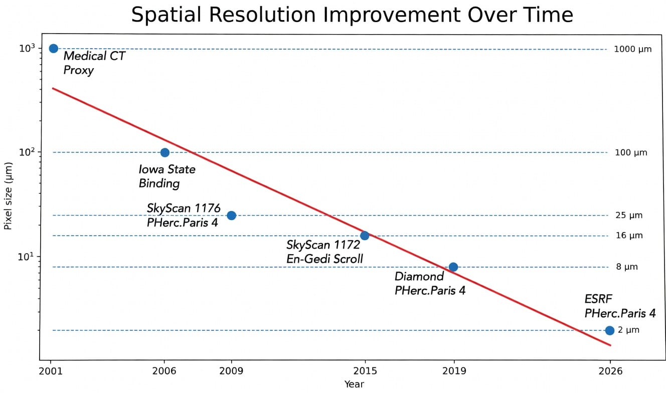 Here's a number that was meaningful to the engineers and investors in the audience: micro-CT scanning resolution has doubled roughly every three years since 2000. Seales calls it the curve nobody talks about, but it rhymes hard with Moore's Law.