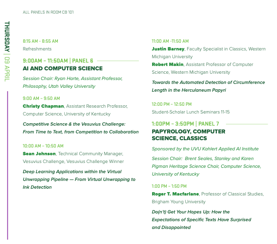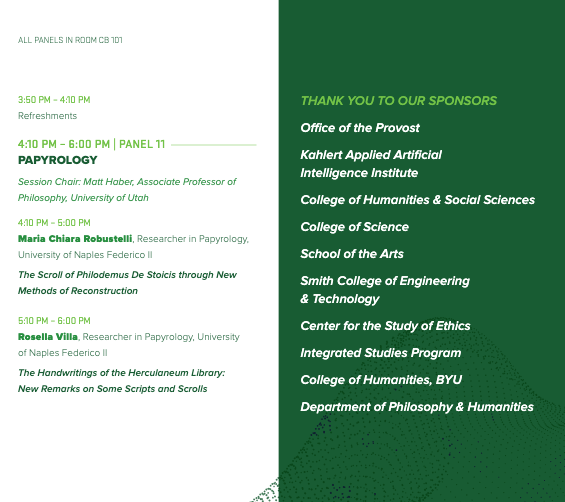 The event also includes collaboration with Brigham Young University, where Classical Studies Professor Roger T. McFarland and other scholars have long been involved in research related to imaging and analyzing ancient papyri.
